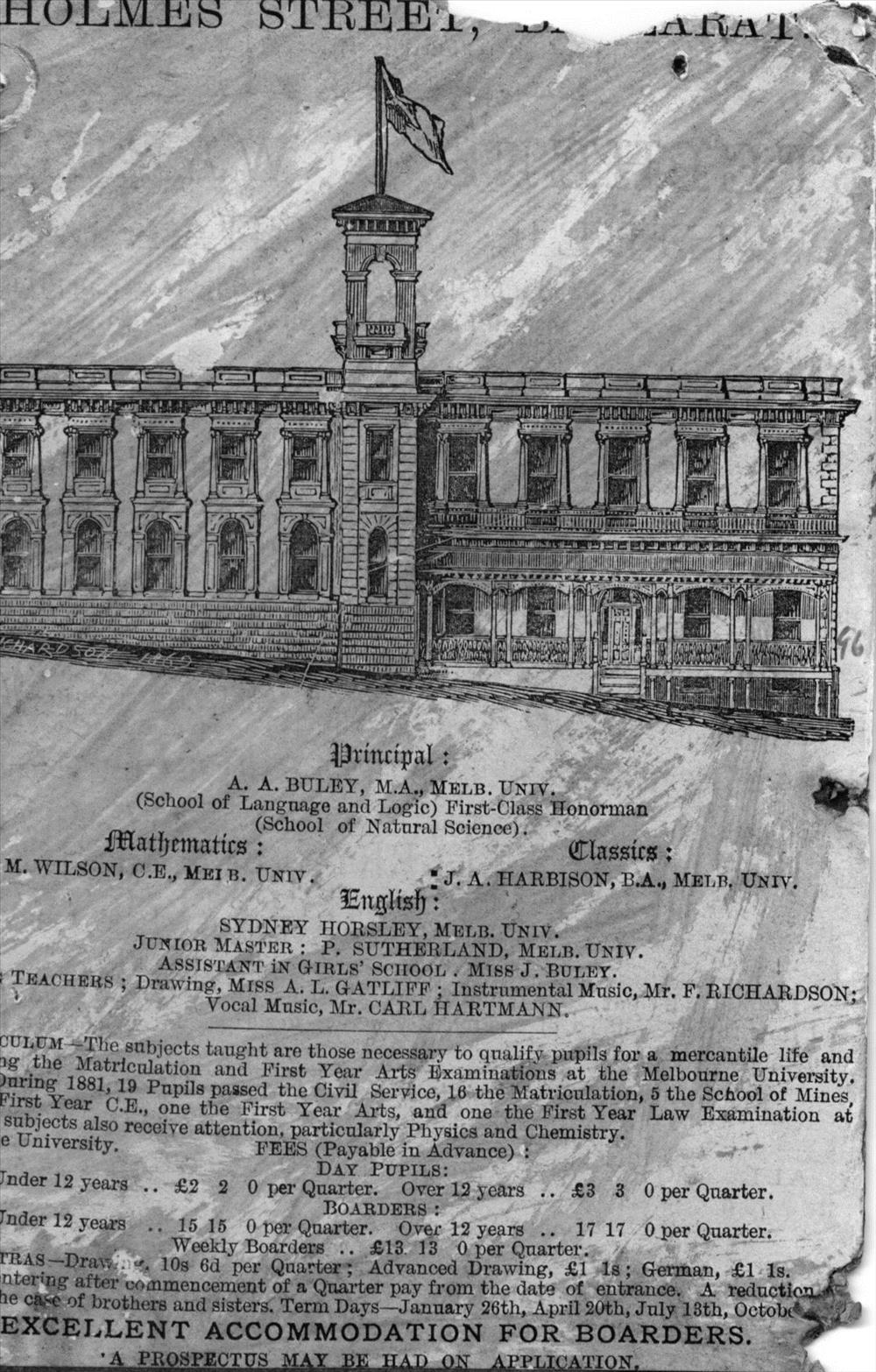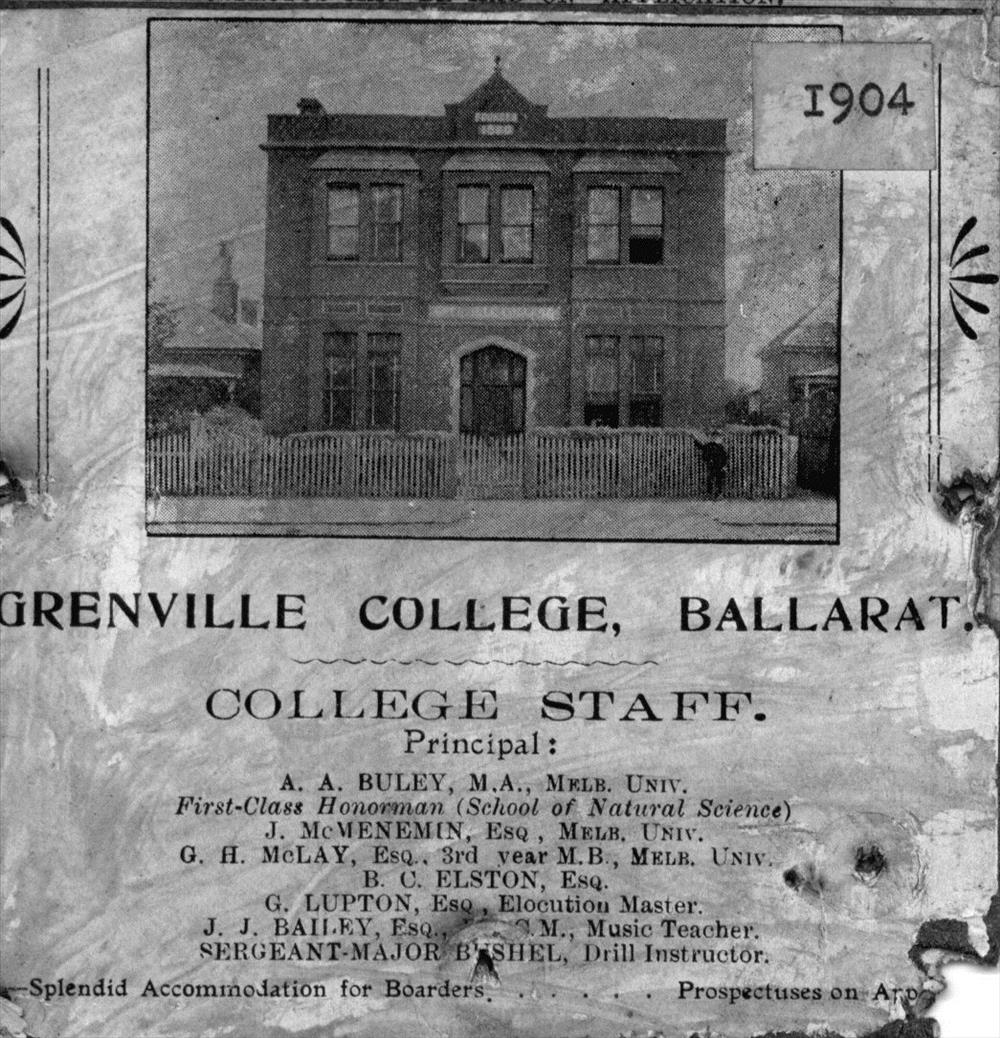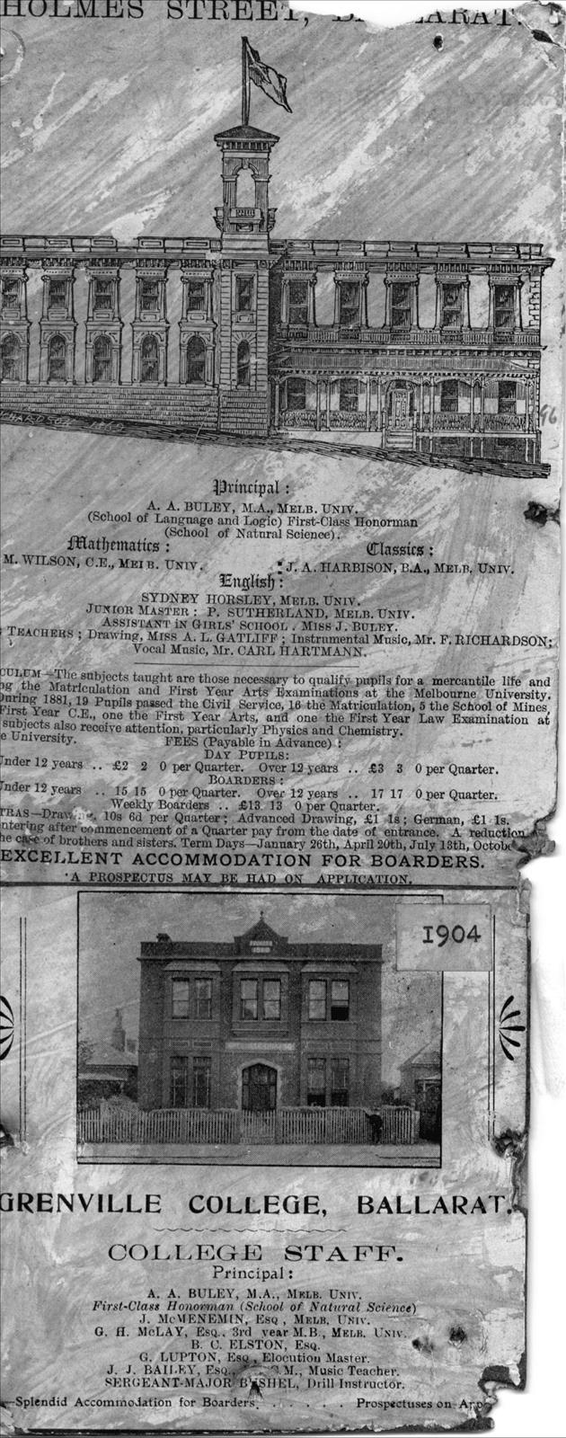 Series of 2 b/w advertisements for Grenville College, Ballarat. Lists staff, curriculum & prices. Bottom advertisement made in 1904. No date on top one but is older.