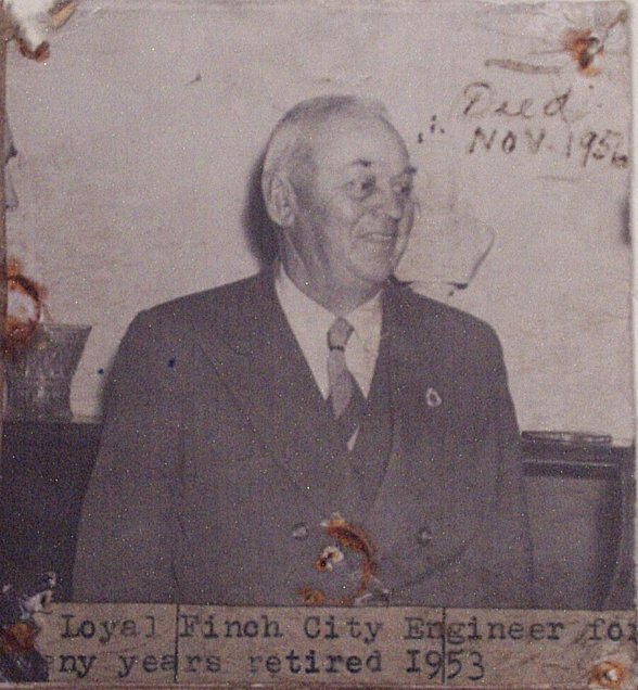 B/w photo of an elderly gentleman. Caption reads: "Loyal Finch, City Engineer for many years, retired 1953". Died Nov. 1956.